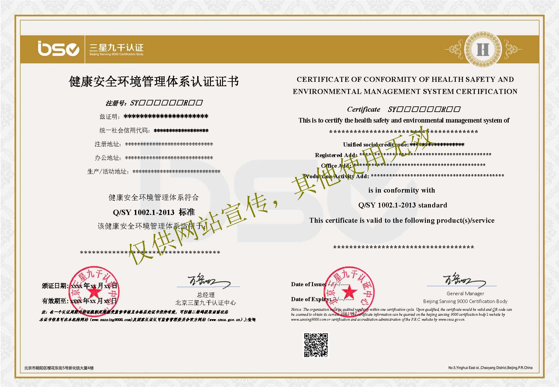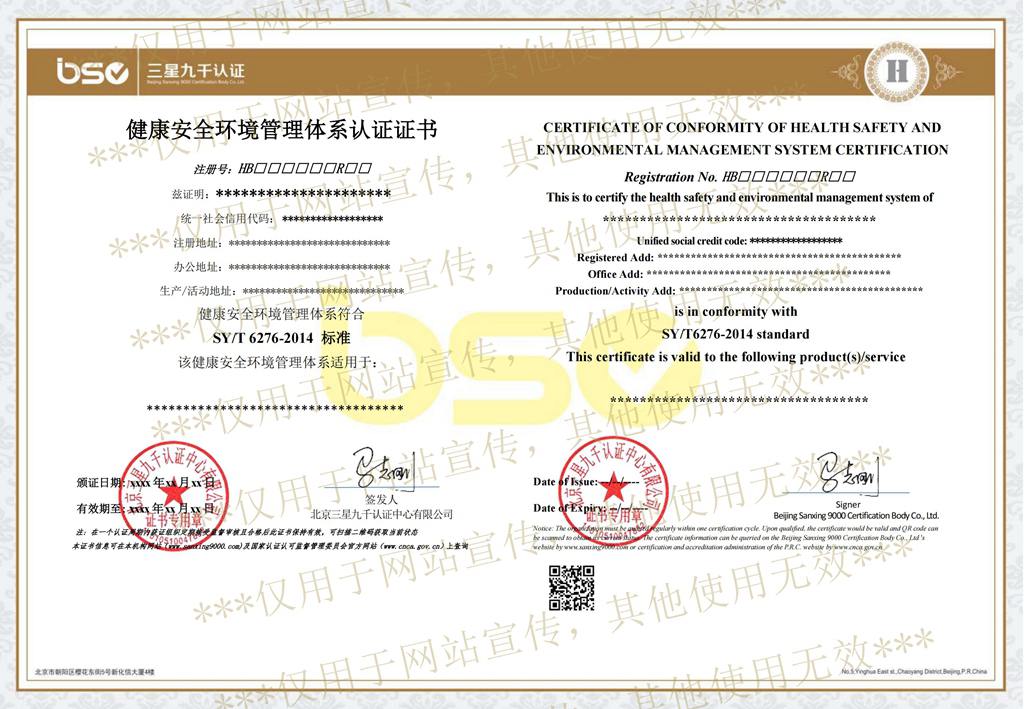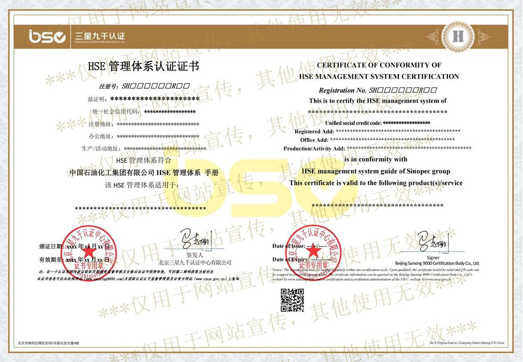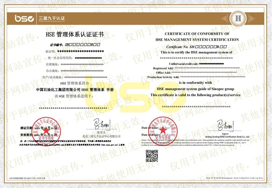 石油化工行業(yè)HSE管理體系認(rèn)證證書(shū)樣本