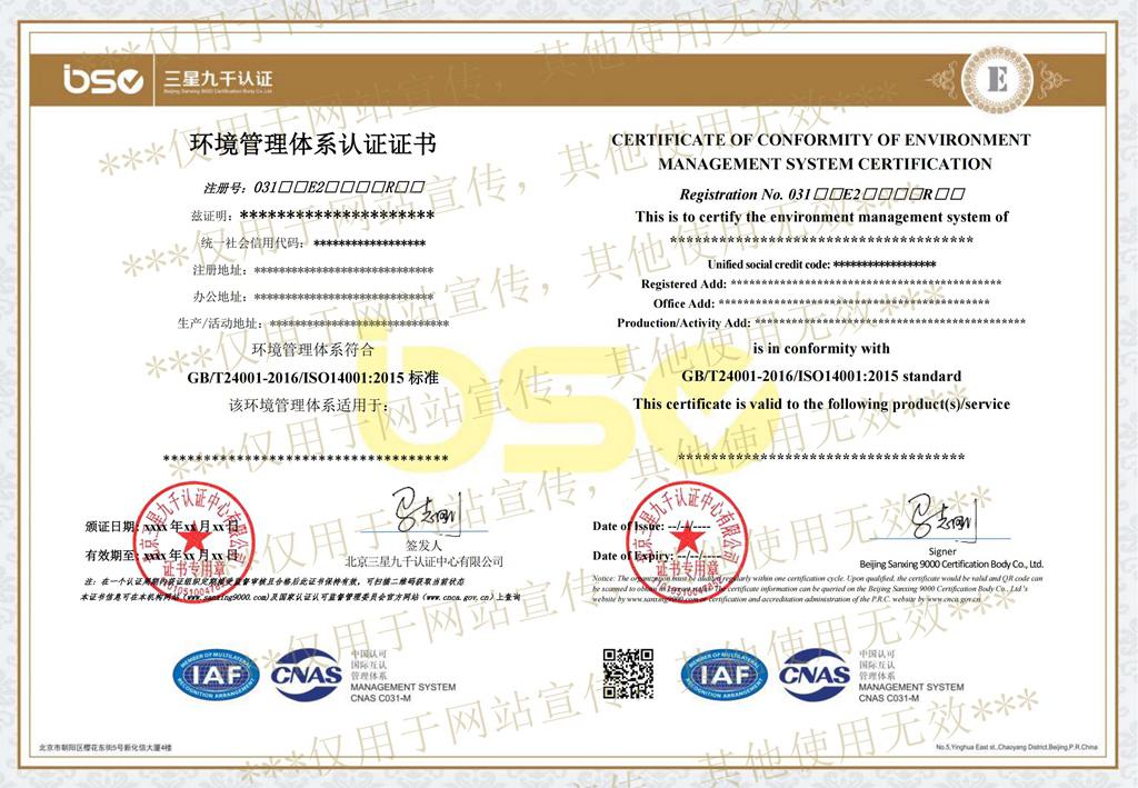 環(huán)境管理體系認(rèn)證證書(shū)樣本