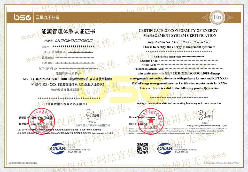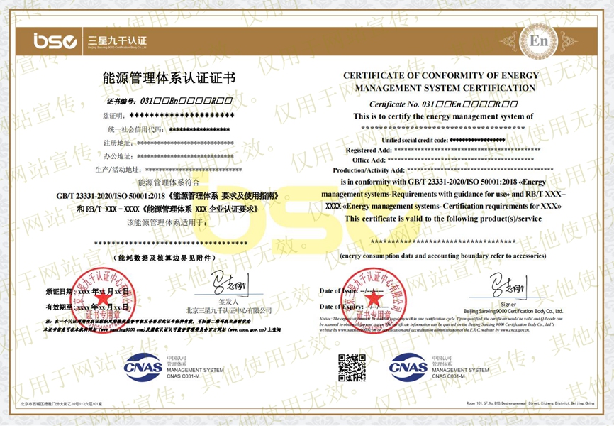 能源管理體系認(rèn)證證書(shū)樣本