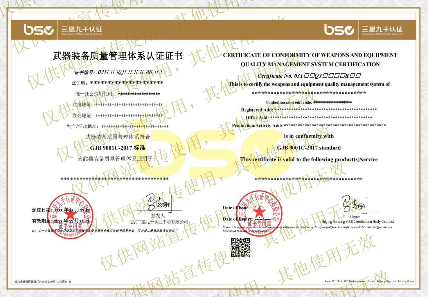 武器裝備質(zhì)量管理體系認(rèn)證證書(shū)樣本