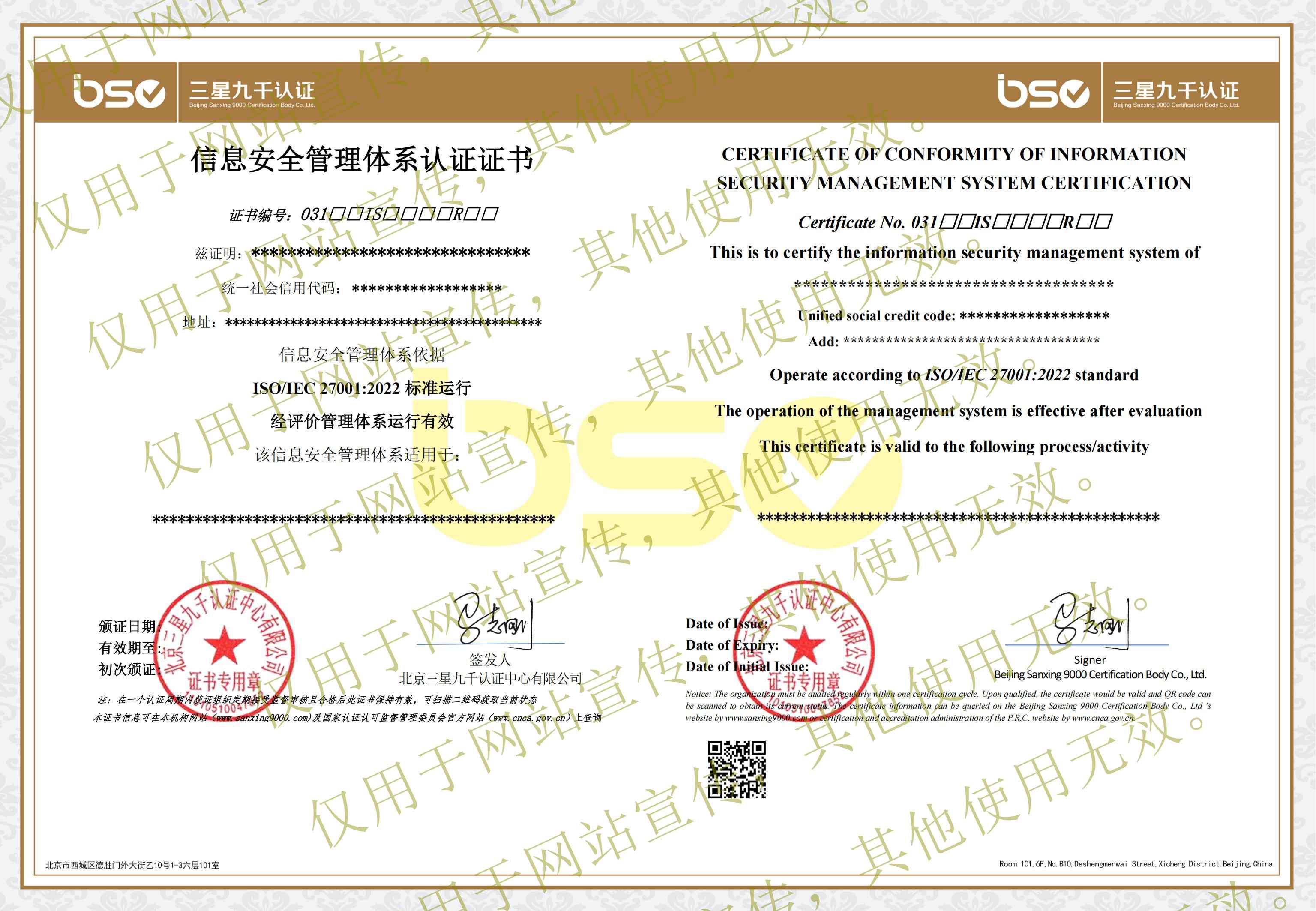 信息安全管理體系認(rèn)證證書(shū)樣本