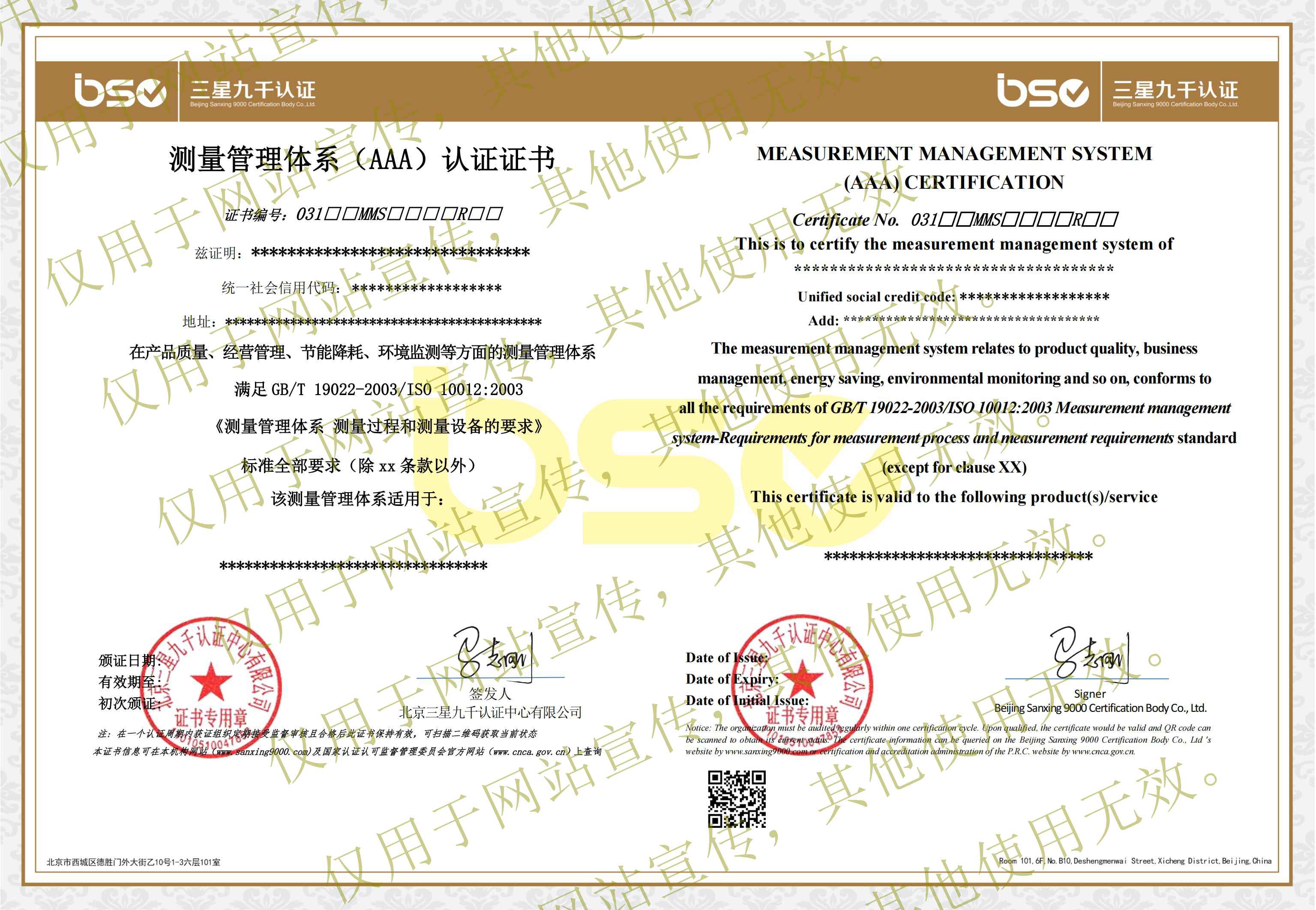 測(cè)量管理體系認(rèn)證證書(shū)樣本