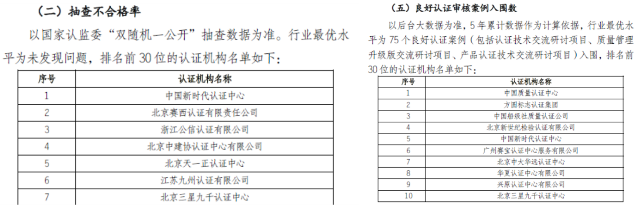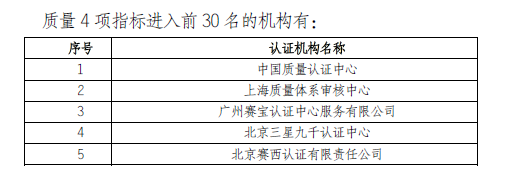 六類評價中,質量指標是核心,北京三星九千認證中心(以下簡稱三星九千)在衡量認證機構認證質量5項指標中,有4項指標——抽查不合格率(行業(yè)最優(yōu)水平為未發(fā)現(xiàn)問題)、注冊認證人員充分率、良好認證審核案例入圍數(shù)、投訴率(行業(yè)最優(yōu)水平為零投訴)排名前列。其它類指標中,還在主持/參與編制的國標行標數(shù)、參與政府部門和認證行業(yè)及相關管理部門的項目數(shù)、核心期刊發(fā)表論文數(shù)、誠信信息等創(chuàng)新、信譽、品牌類指標排名領先。