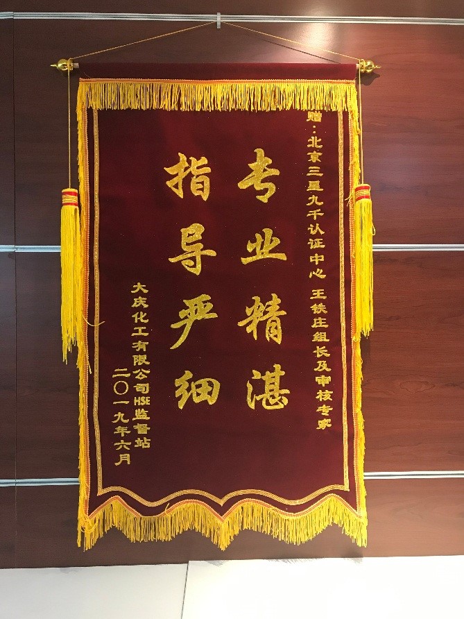 客戶贈(zèng)送的錦旗是對中心審核團(tuán)隊(duì)最大的肯定,充分體現(xiàn)了客戶對中心審核員職業(yè)精神和專業(yè)能力的認(rèn)可和贊許。據(jù)悉,大慶油田化工審核組由王鐵莊老師擔(dān)當(dāng)審核組長,馬佳、周振宏、薛建、阮增偉、張永超、劉友珍、李玉紅、楊慶鴻、趙莉(大慶)、張艷等審核老師擔(dān)任組員。在審核期間,審核組一直秉持客觀、公正、負(fù)責(zé)的工作態(tài)度,認(rèn)真審核、嚴(yán)格把關(guān),以專業(yè)解決問題,用服務(wù)助力客戶提升價(jià)值,得到了客戶方的充分認(rèn)可與尊重,在客戶心中樹立了三星九千品牌的良好形象。