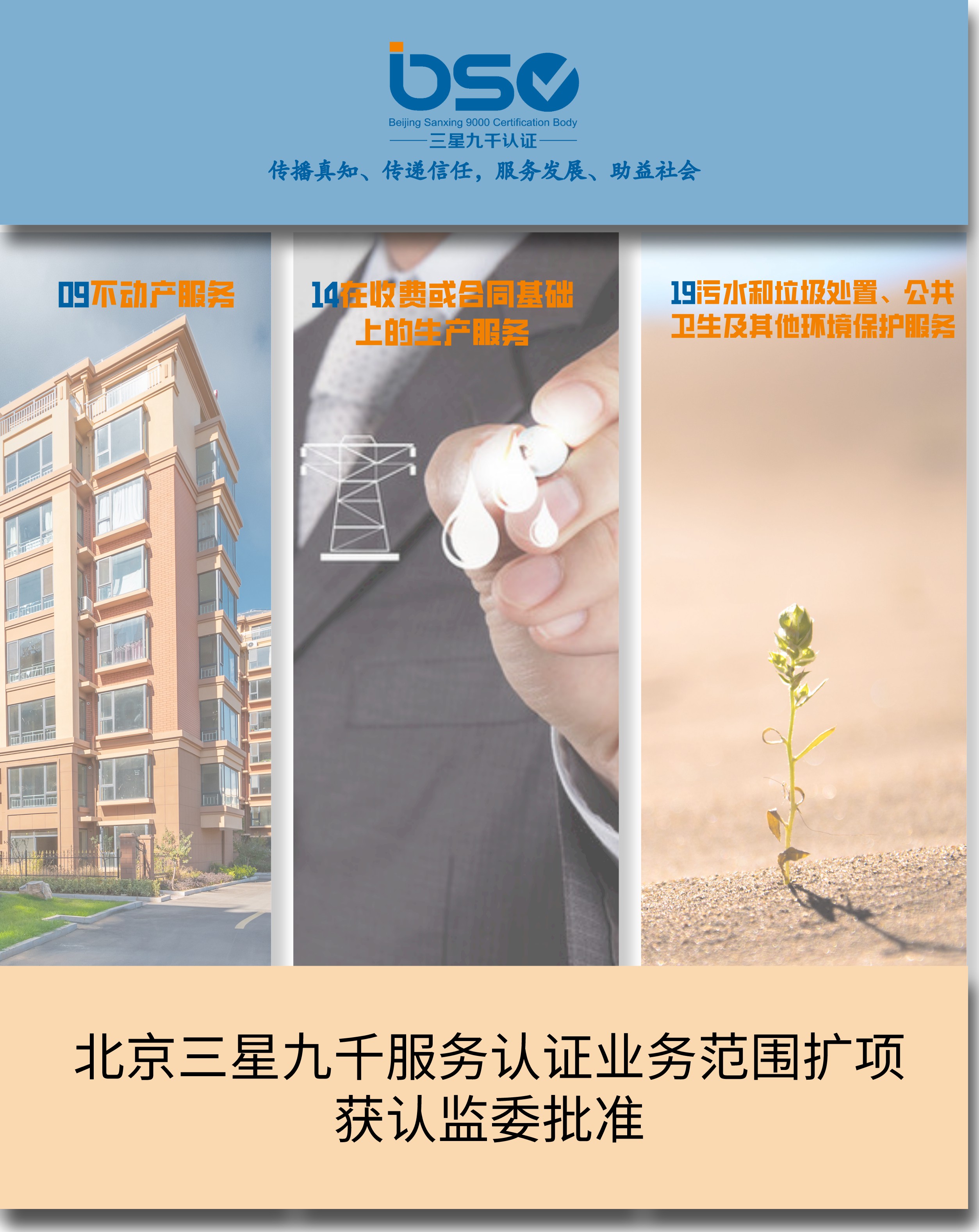 2020年7月8日,北京三星九千認證中心順利通過國家認證認可監(jiān)督管理委員會的行政審批,成功取得“09不動產(chǎn)服務(wù);14在收費或合同基礎(chǔ)上的生產(chǎn)服務(wù);19污水和垃圾處置、公共衛(wèi)生及其他環(huán)境保護服務(wù)” 3個領(lǐng)域的服務(wù)認證資質(zhì)。