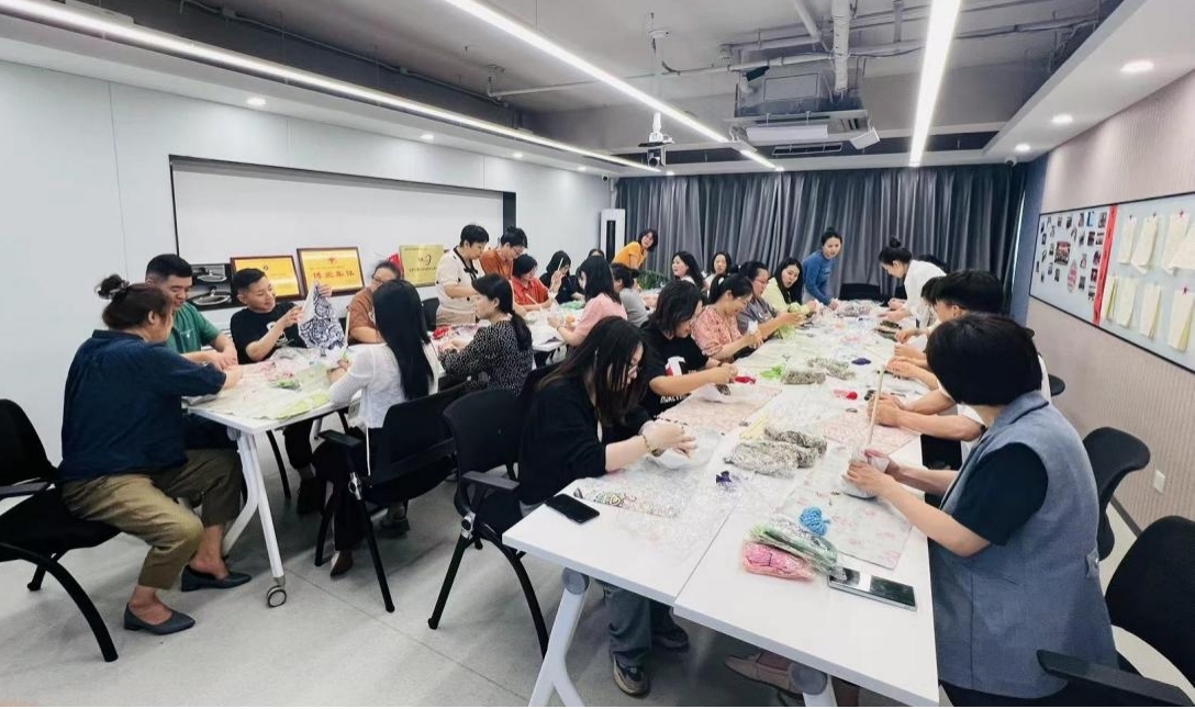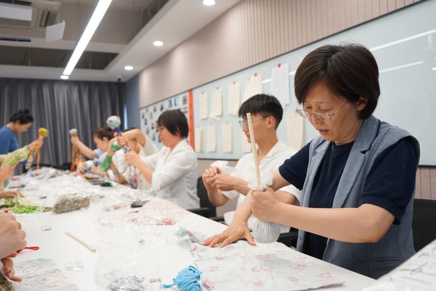 活動(dòng)伊始,活動(dòng)組織者首先向大家介紹了端午節(jié)掛艾草的民俗背景及艾草藥用價(jià)值和中醫(yī)養(yǎng)生知識(shí),讓大家對(duì)艾草有了更深入的了解;進(jìn)入手工DIY環(huán)節(jié),向大家現(xiàn)場(chǎng)演示了艾草錘的制作方法和使用方法。隨后,員工們紛紛動(dòng)手嘗試,按順序鋪平布料、將曬干的艾草放在中間,用布料裹住,捏成一個(gè)緊實(shí)的圓形,插入木棍,拿出繩子將剩余的布料緊緊捆綁成柱形,大家有條不紊,一邊完善手工步驟,一邊互幫互助,一個(gè)個(gè)精致的艾草錘在大家的手中逐漸成形,隨后大家用做好的艾草錘敲敲肩頸、捶捶后背,拍打之間,經(jīng)絡(luò)暢達(dá)、身心舒暢,整個(gè)活動(dòng)現(xiàn)場(chǎng)充滿了歡聲笑語,氣氛熱烈而融洽。